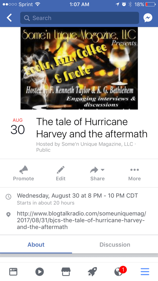 Tonight at 8pm CST, Books, Jazz, Coffee, & Smoke is coming on! Visit us at http://www.blogtalkradio.com/someuniquemag/2017/08/31/bjcs-the-tale-of-hurricane-harvey-and-the-aftermath to listen to the show as well as call in. Your hosts F. Kenneth Taylor, K.G. Bethlehem and Leonila Barnes will talk about current events and fiction as well for our 2-hour podcast!