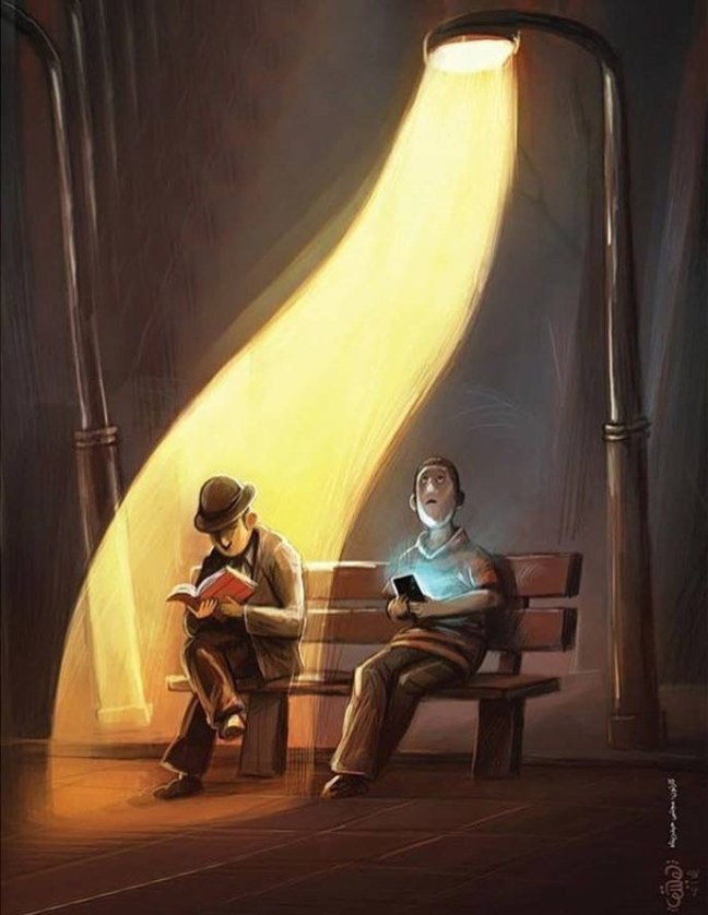 I waiting room at doctor I am only one with a book. Everyone else has one of those things.