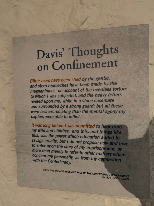 Confederate stronghold which served ultimately as a prison for the usurper, the president of the Confederacy, Jefferson Davis. Fort Monroe stood for many years including several wars after its inception: WWI, WWII to name a few.