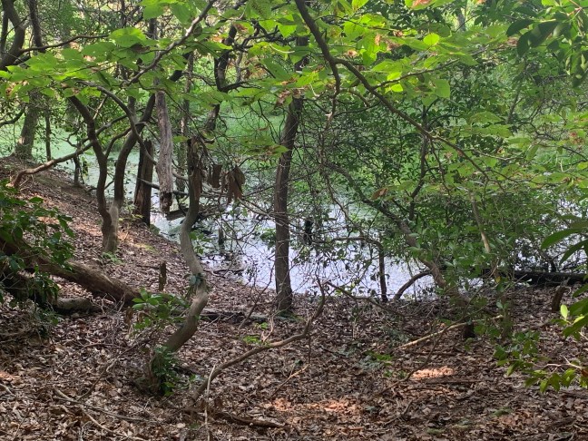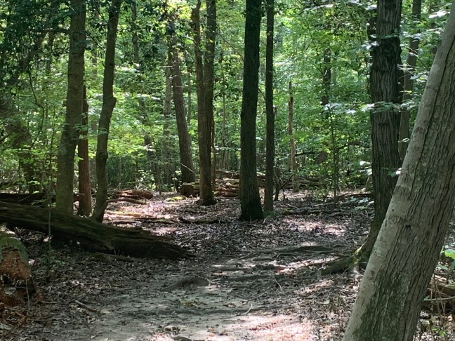 I exited the first walkway, and as I started uphill, I saw a black snake ahead, crossing my path as it entered the underbrush of the woods. I stood still for thirty seconds and proceeded onwards. That was the first and last I saw of it. I’m not too fond of snakes. Therefore I did not have a witty reply to its presence. I was just happy it left without an incident.