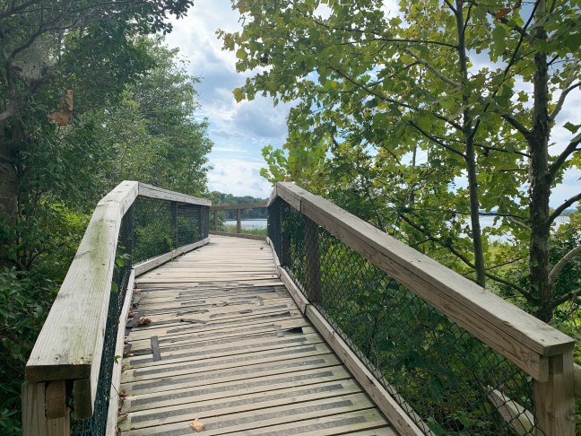 That walkway was showed the brilliance of human and nature working collectively to inspire us. The water cover with lily pads, moss and other vegetation but it also showed a clearness of its depth. If I were hiking in Florida or Louisiana, I would not attempt this walk. To give context, I seen quite a few alligators in my time when I visited relatives on the fishing grounds of nearby lakes and streams. Alligators love lily pads, especially when the sun is at high noon, the hottest point of the day. It gives them shade but also shields them as they hunt. I was glad to be in Virginia that day. I pressed on, and as I walk towards the dirt path, I saw another entranceway. It was another walkway, but this one proceeded into the open water of the river, the Potomac River of the DMV.
