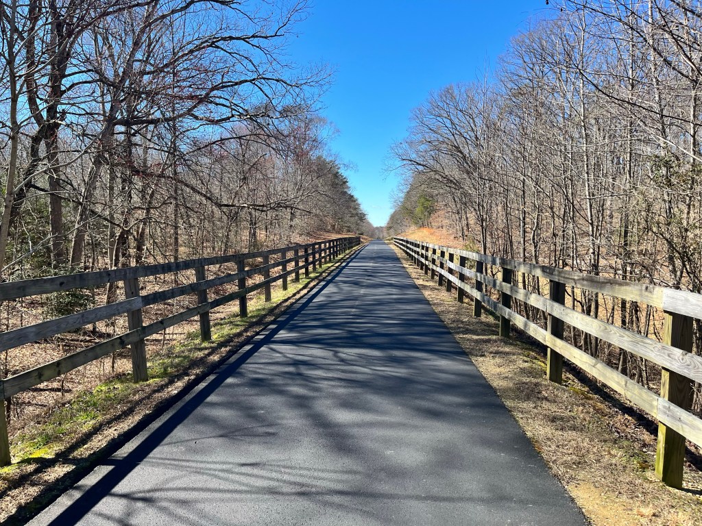 Indian Head Trail, located near the heart of Charles County, Maryland, is visited by runners, walkers, and cyclists throughout the year. Formerly a railroad, it was transformed into what we see today around 2009. The 13-mile paved rail trail moves beside creeks and through woods halfway across Charles County from the town of Indian Head on the Potomac River to the interior community of White Plains. The trail follows a retired railroad line built in 1918 to transport supplies to the U.S. Navy’s weapons facility on the Indian Head peninsula overlooking the Potomac River. Just a quick overview of the historical significance of the area for which I owed the TrailLink site; thanks for providing the information.